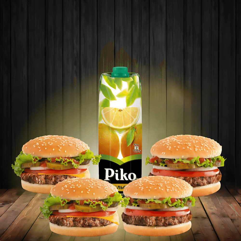 Внутри: классический гамбургер, сочный чизбургер, мини-версии любимых бургеров — гамбургер мини и чизбургер мини, а дополняет всё это литровый освежающий Cок Пико.