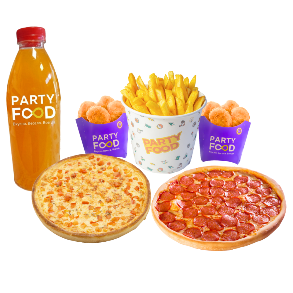 К ним — две порции хрустящих наггетсов, большой баскет картофеля фри и 1 литр освежающего яблочного компота.
