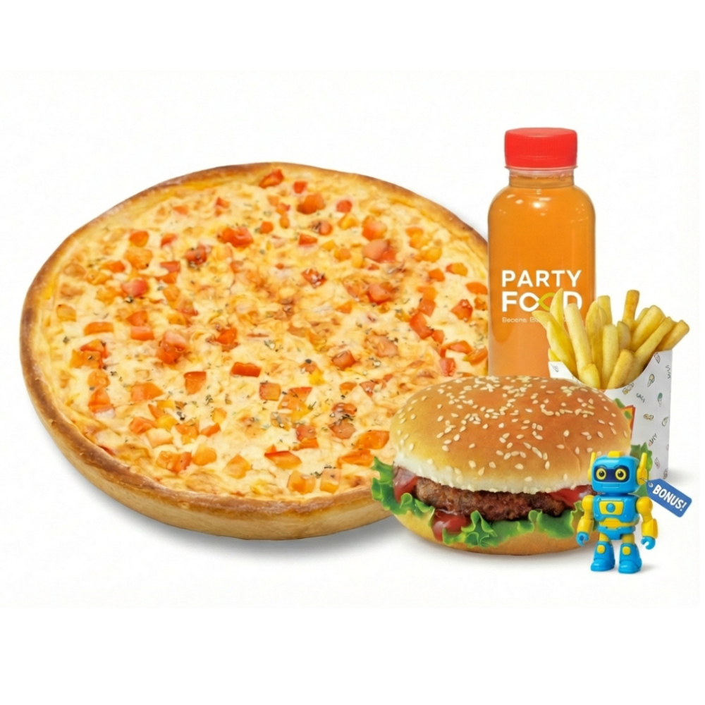 Пышная пицца «Маргарита» 25 см с нежным сыром и ароматным соусом, а также сытное меню: сочный бургер, хрустящий картофель фри, освежающий яблочный компот и приятный бонус — игрушка. Отличный вариант для вкусного и настроенческого перекуса