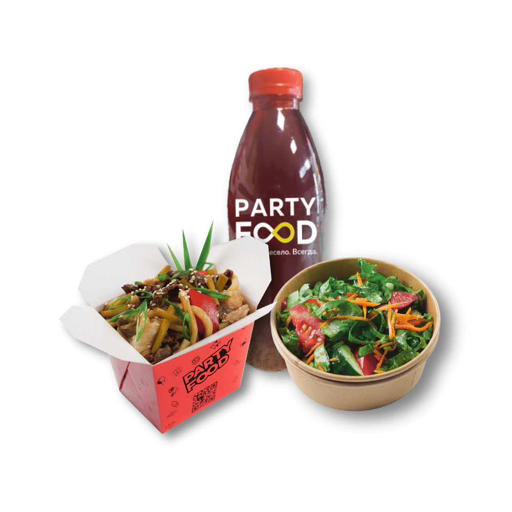 Wok меню говяжий — горячая ароматная лапша wok с сочной говядиной, обжаренной на сильном огне до румяной корочки, в насыщенном соусе с хрустящей китайской капустой, сладким болгарским перцем, свежим сельдереем и шиитаке. В комплекте освежающий салат «Фреш» из пекинской капусты, томатов и огурцов и натуральный компот 1 л.
