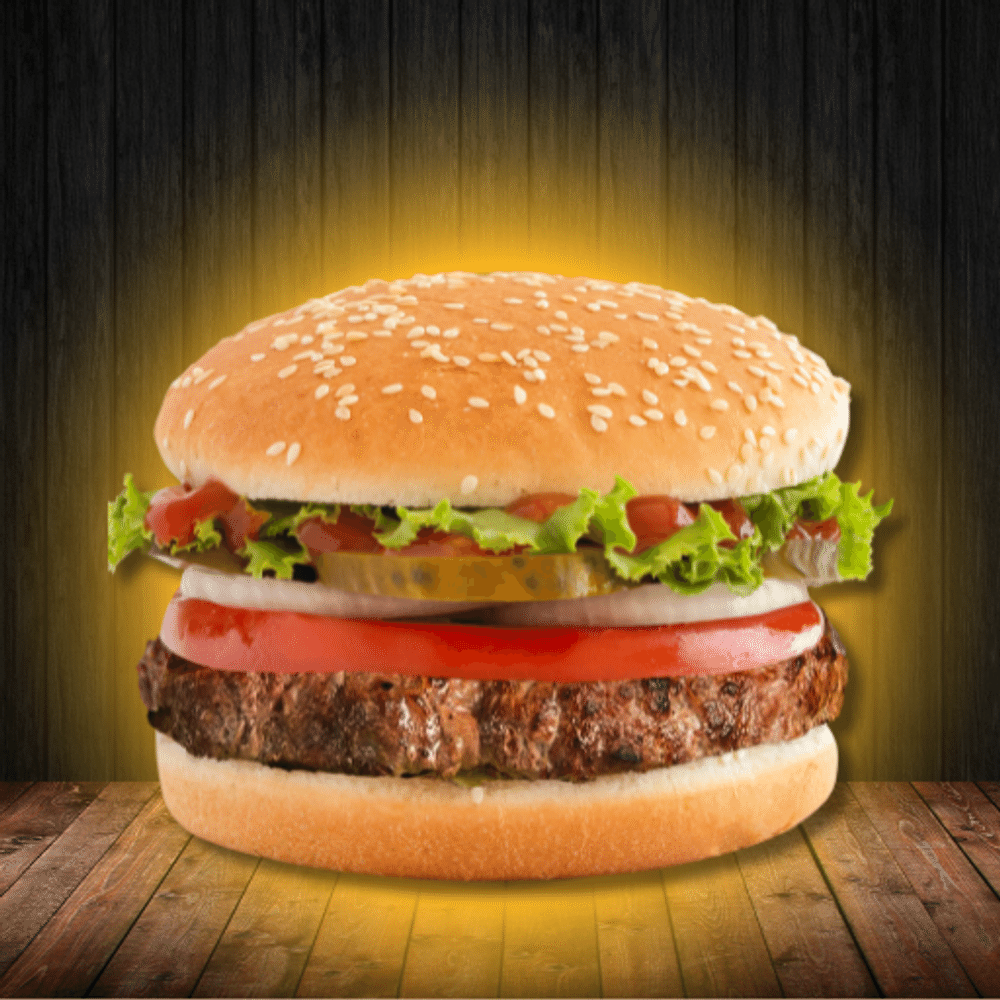 Сочный говяжий бургер с маринованными огурцами, свежими помидорами и мягкой воздушной булочкой, дополненный нашим фирменным соусом. Идеальное сочетание свежести и насыщенности в каждом укусе — для настоящих ценителей