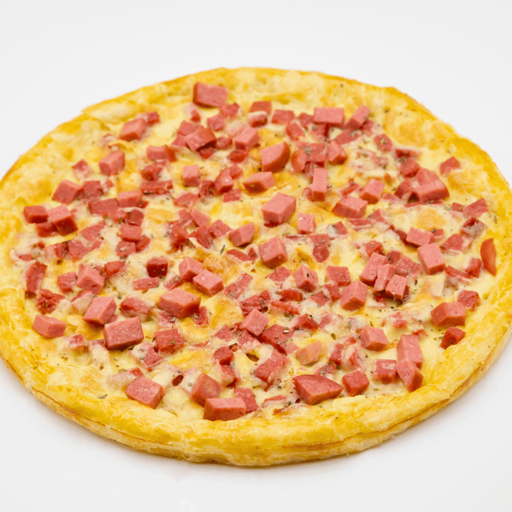 Пицца с копчёной колбасой, плавящимся сыром и ароматным орегано, дополненная насыщенным томатным соусом. Каждый кусочек — это идеальный баланс копчёного аромата и классических вкусов, который не оставит равнодушным!