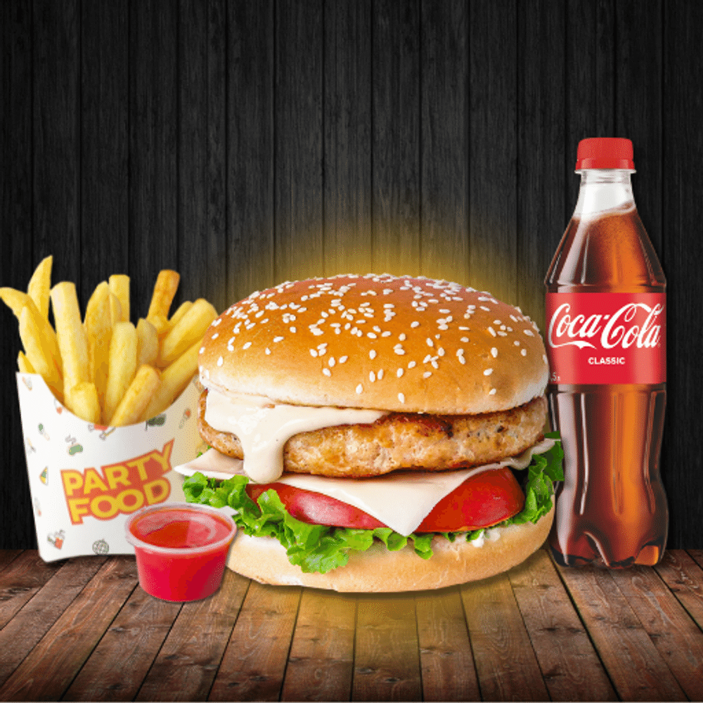 Сочное куриное филе, тающий сыр и свежие ингредиенты в мягкой булочке — чикен чизбургер, который покорит с первого укуса! В комплекте — хрустящая картошка, соус и освежающий напиток. Полноценный обед для настоящих гурманов!
