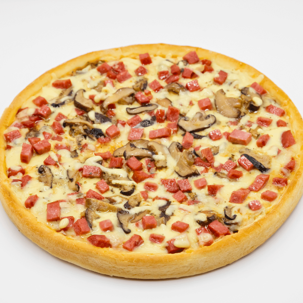 Эта пицца сочетает в себе насыщенный вкус копчёного мяса и свежесть грибов, создавая идеальный баланс для настоящих гурманов!