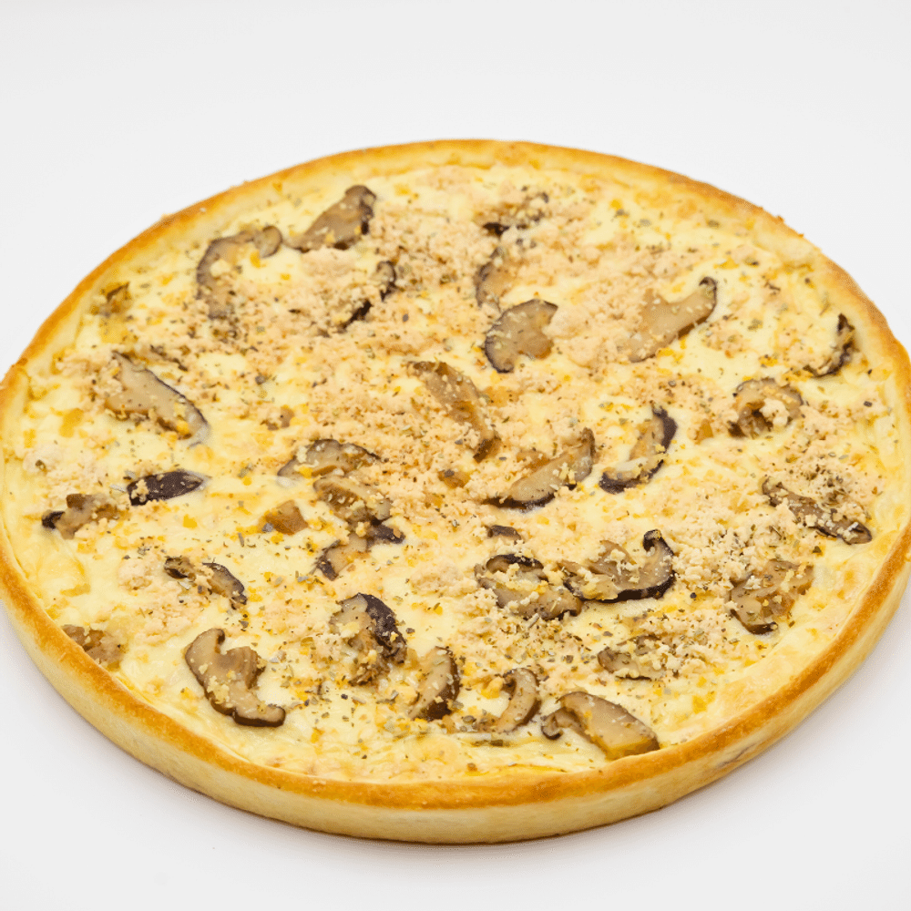 Пицца с нежной куриной грудкой, сочными грибами, плавящимся сыром и ароматным орегано в сочетании с томатным соусом.