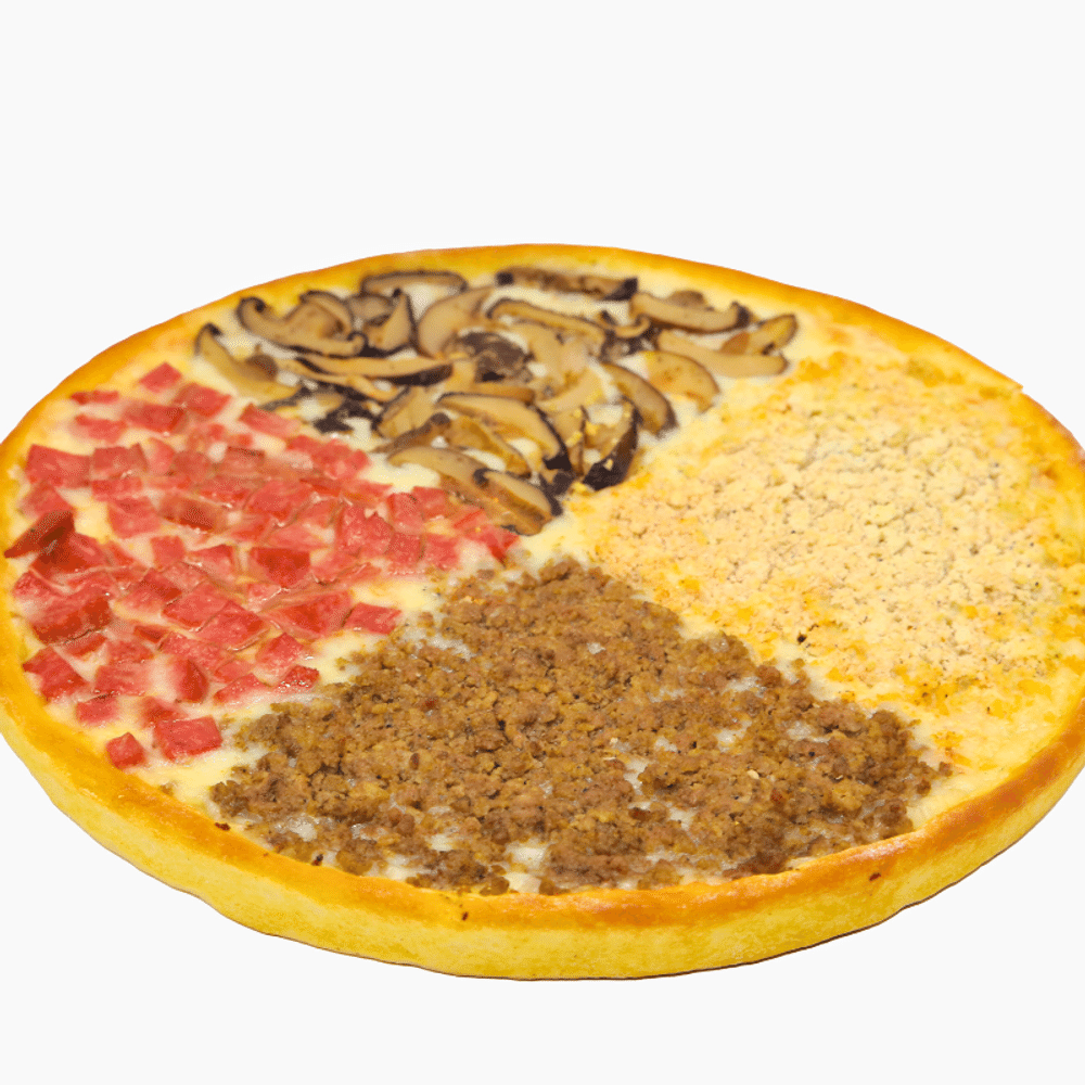 Четыре восхитительных вкуса в одной пицце: ароматная колбаска, аппетитный говяжий фарш, нежные грибы и отборная курочка