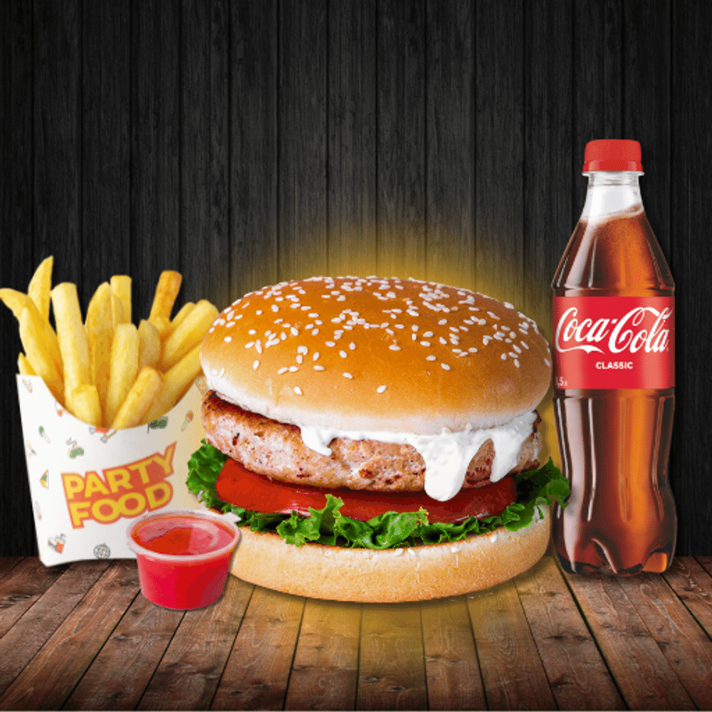 Хрустящий куриный бургер с нежным филе, золотистая картошка, любимый соус и напиток — идеальное сочетание для тех, кто любит сытно и вкусно перекусить.